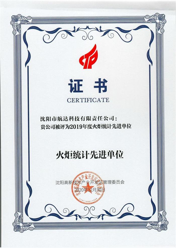 沈陽(yáng)市航達(dá)科技有限責(zé)任公司被評(píng)為2019年度火炬統(tǒng)計(jì)先進(jìn)單位